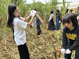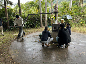 サトウキビ狩り体験では、蒸しパンの出来上がりを待つ間に、自分たちよりも背の高いサトウキビを狩って絞り、ジュースを作りました。