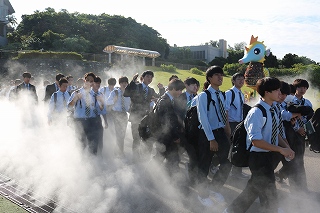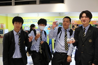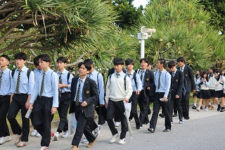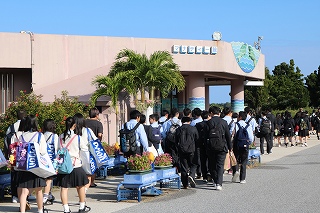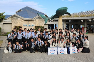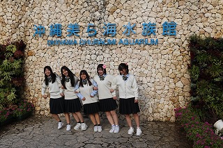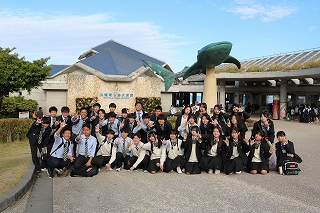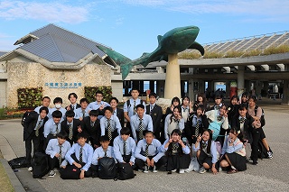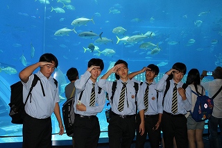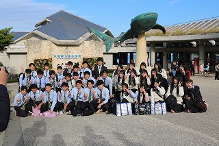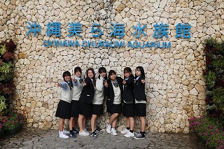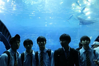 修学旅行も最終日を迎えました。朝食をとった後、ホテルを出発して徒歩10分で「美ら海水族館」に到着。クラスごとに集合写真を撮り自由に館内を見学しました。ウミガメやマナティなどさまざまな海洋生物が見られ、マンタが身体を翻しながら餌を食べる瞬間やジンベイザメが立っている姿で餌を食べている場面にも遭遇することができました。美しい海に生息する生き物を生徒たちは興味深そうに眺めていました。