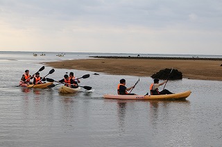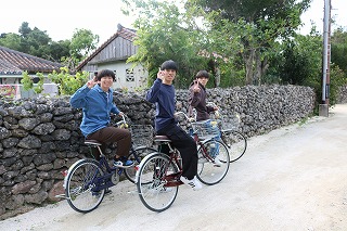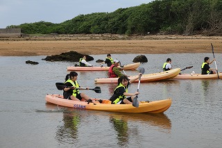 バスで宮良川へ移動し、カヌーの操作の説明を受けた後二人一組でカヌーを漕ぎ出しました。初めは方向が定まらず苦戦していましたが、ペアで声を掛け合ううちに呼吸があってきて自由自在に操作し、速度も上がっていました。生徒たちは宮良川に群生するマングローブを観察しながらカヌーを楽しんでいました。その後、昼食をとってから竹富島へ向かいました。石垣島からフェリーに乗って約15分で竹富島に到着、サイクリングに関する説明を受けた後、自転車で島内をまわりました。石垣や赤瓦屋根の家が並ぶ街並みを走り抜けて「西桟橋」や「コンドイビーチ」などを訪れ、透明な美しい海を眺めていました。またカイジ浜では「星の砂」を探している生徒もいました。普段見られない風景を目の当たりにして、貴重な経験となったようです。