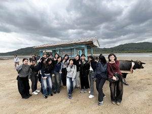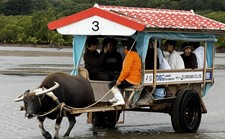 石垣島からフェリーで約40分八重山諸島で最も広い西表島に到着しました。そこから遊覧船に乗り換え、日本最大規模といわれる雄大なマングローブ林を眺めながら仲間川を進んでいきます。八重山諸島を中心に群生するヤエヤマヒルギが多く見られました。生徒たちは壮大な自然の姿を息をのんで見ていました。続いて由布島へ行きましたが、西表島から由布島までは船ではなく「牛車渡し」で移動します。水牛が曳く牛車に乗って移動している間、御者の方は三線を弾いてくださり、風情を味わいながらゆったりとした時間を楽しみました。普段水牛を見る機会がない生徒たちは珍しそうに水牛を見ていました。そして石垣島に戻って石垣島中心商店街ユーグレナモールでショッピングを楽しみました。