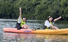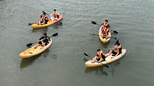 U4はU1と午前、午後を入れ替わる選択となりました。まずホテルを出た後石垣港から竹富島までフェリーで渡り、港でレンタルサイクルの方から諸注意を聞き、お店まで15分ほど歩いて自転車を借りました。生徒たちは各々、島内を探索しましたが、多くはコンドイビーチや星砂の浜をめざしていました。それぞれの砂浜では関西のビーチでは味わえないきれいな景色を堪能していました。その後、生徒たちはお店で自転車を返却し、港に戻り石垣港まで船で戻りました。昼食は「石垣食堂」でいただきました。こちらでは冬至の日に炊き込みご飯(ジューシー)を食べる習慣があり、炊き込みご飯と八重山そばのセットを食べました。そして、次のアクティビティは宮良川でのカヌー体験です。男子はスピードを競い合えるようになり、女子も楽しく声をかけながら川を進めるようになるなど、みんなが楽しくカヌーを操れるようになりました。