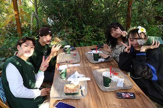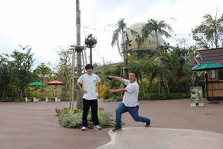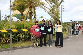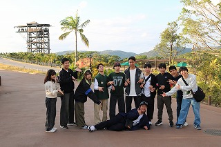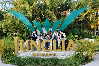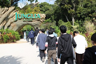 那覇空港からバスに乗り、車内で昼食のタコライスのお弁当をいただきました。約2時間で「ジャングリア」に到着。今年の夏に開園したテーマパークですが、生徒たちはさまざまなアトラクションを楽しんでいました。