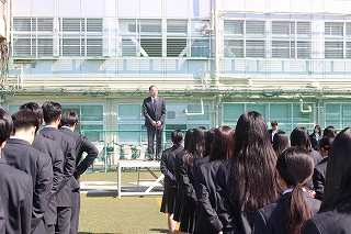 各々の教室でHRの後、生徒たちは緊急災害時の避難経路を確認をしながらグラウンドに集合しました。その後、学校長からの挨拶とクラブ表彰がありました。